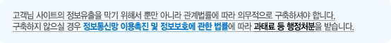 ¡°Á¤º¸Åë½Å¸Á ÀÌ¿ëÃËÁø ¹× Á¤º¸º¸È£¿¡ °üÇÑ ¹ý·ü¡± ¿¡ µû¶ó °³ÀÎÁ¤º¸¸¦ Ãë±ÞÇÏ´Â »çÀÌÆ®¿¡¼ °³ÀÎÁ¤º¸Ãë±Þ¹æÄ§À» °ø°³Çϰí À̸¦ ÀüÀÚÀû Ç¥½ÃÇÏ´Â °ÍÀÌ Àǹ«È µÇ¾úÀ¸¸ç ÀÌÇàÇÏÁö ¾ÊÀ» °æ¿ì °úÅÂ·á µî ÇàÁ¤Ã³ºÐÀ» ¹Þ°Ô µË´Ï´Ù.